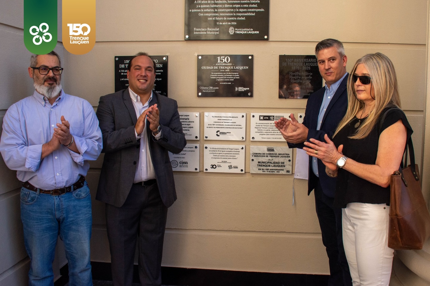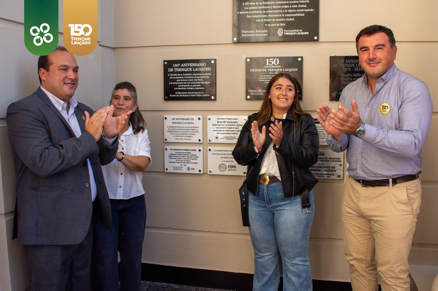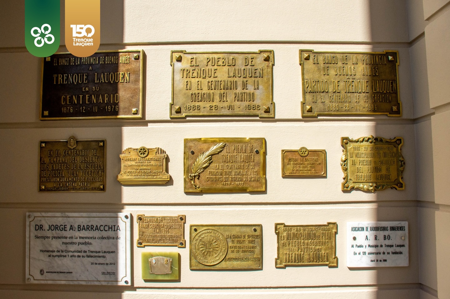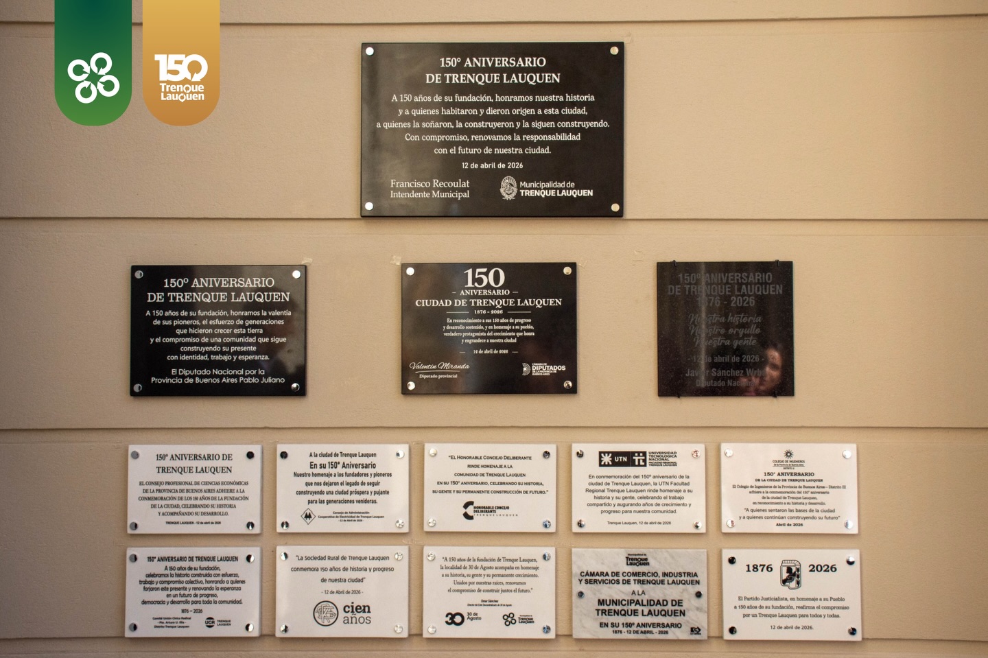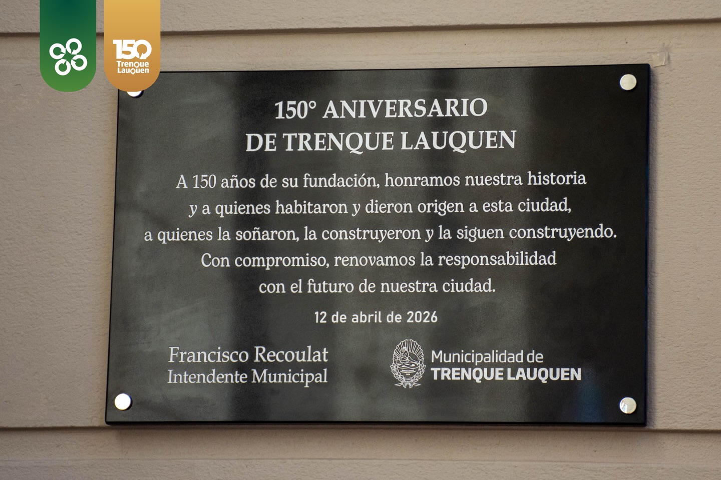 Las placas. La primera la de la Municipalidad de Trenque Lauquen, que dice “A 150 años de su fundación, honramos nuestra historia y a quienes habitaron y dieron origen a esta ciudad, a quienes la soñaron, la construyeron y la siguen construyendo. Con compromiso, renovamos la responsabilidad con el futuro de nuestra ciudad”.