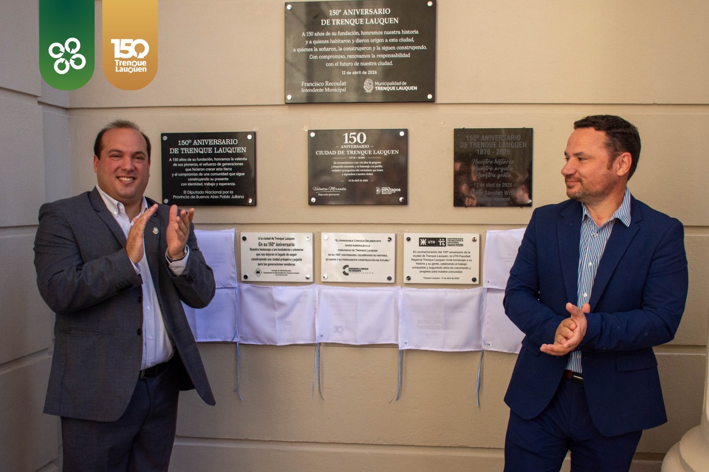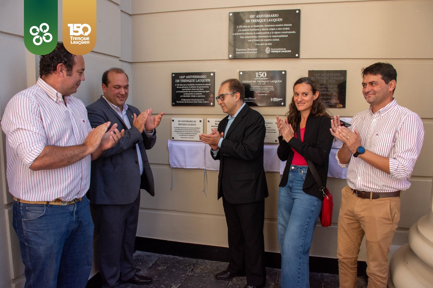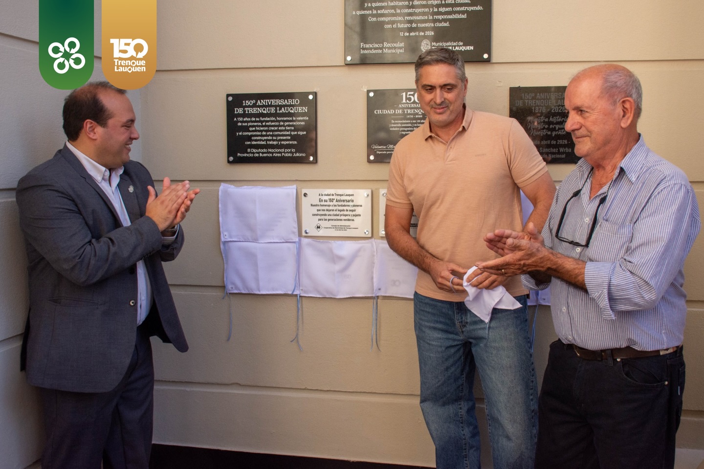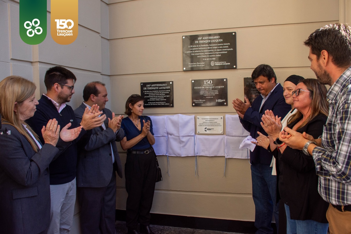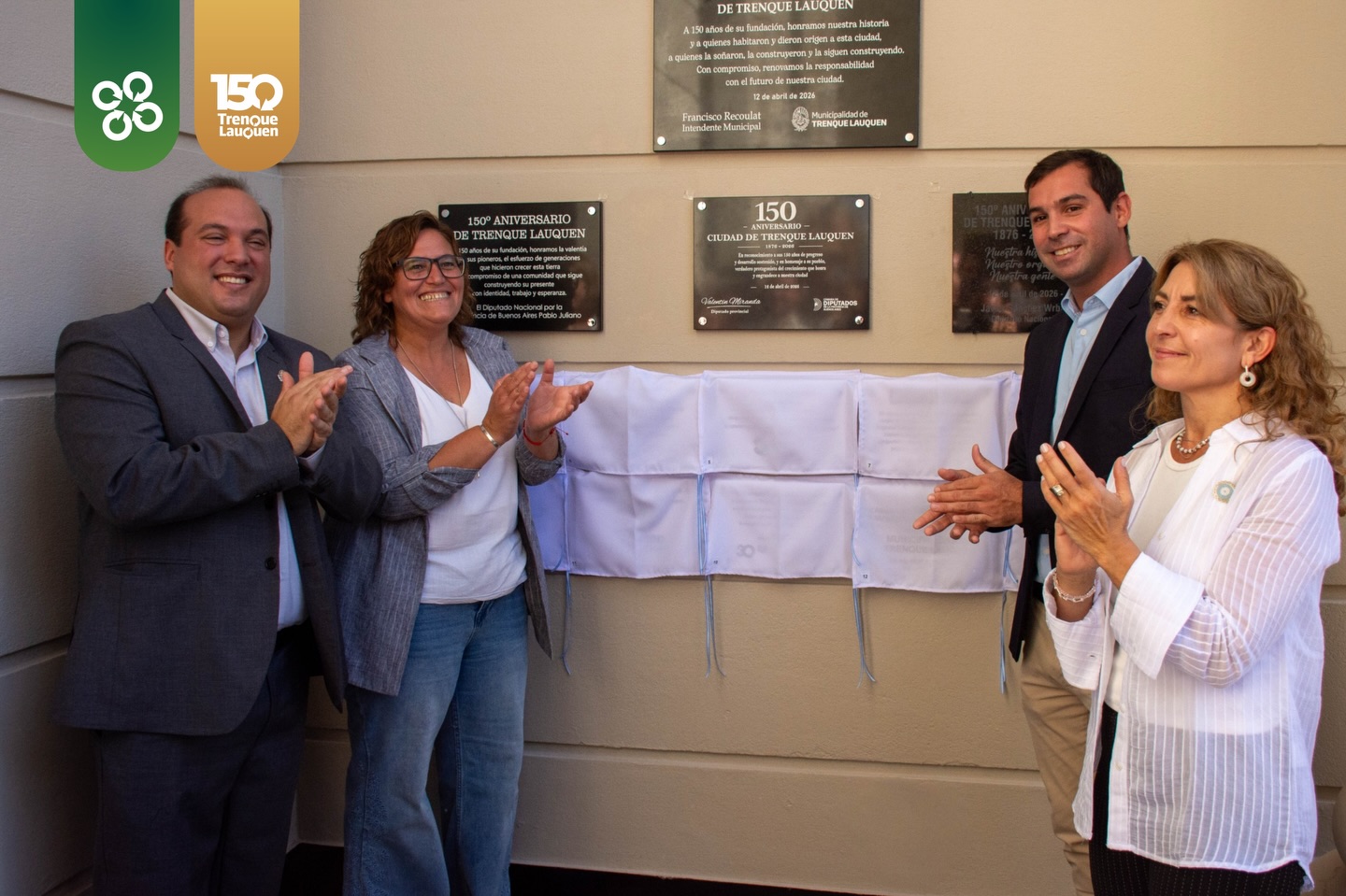 Las placas. La primera la de la Municipalidad de Trenque Lauquen, que dice “A 150 años de su fundación, honramos nuestra historia y a quienes habitaron y dieron origen a esta ciudad, a quienes la soñaron, la construyeron y la siguen construyendo. Con compromiso, renovamos la responsabilidad con el futuro de nuestra ciudad”.