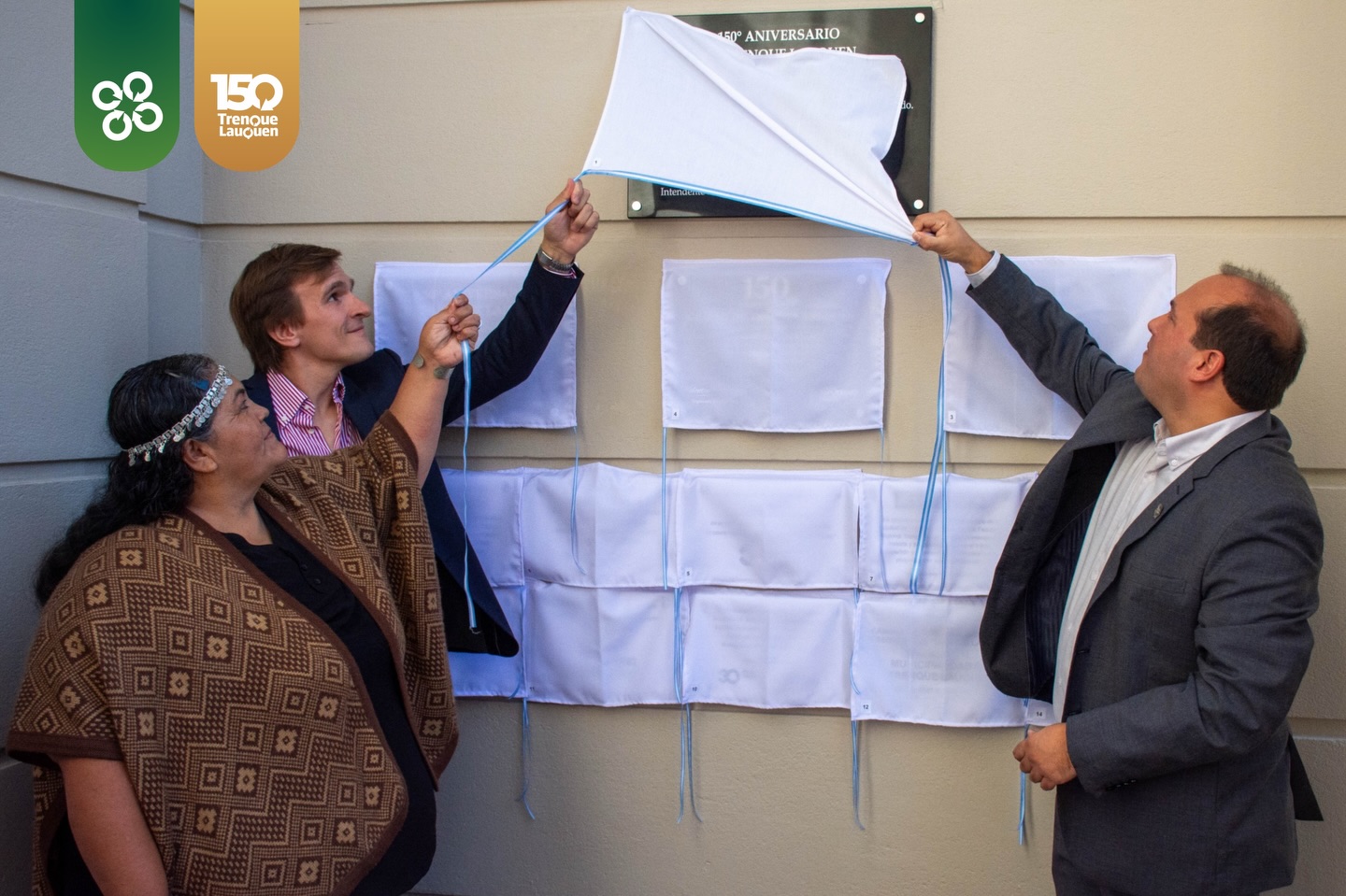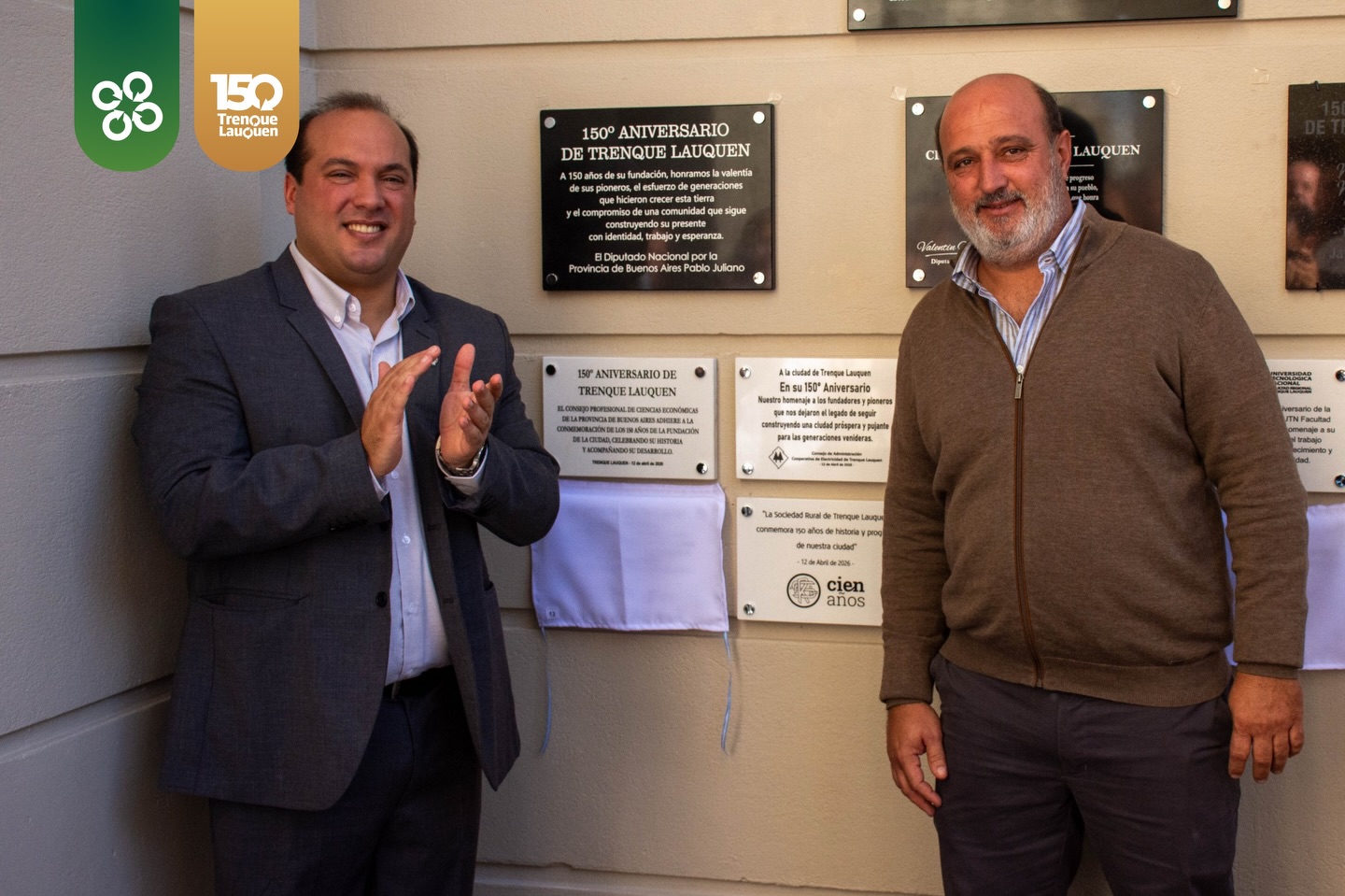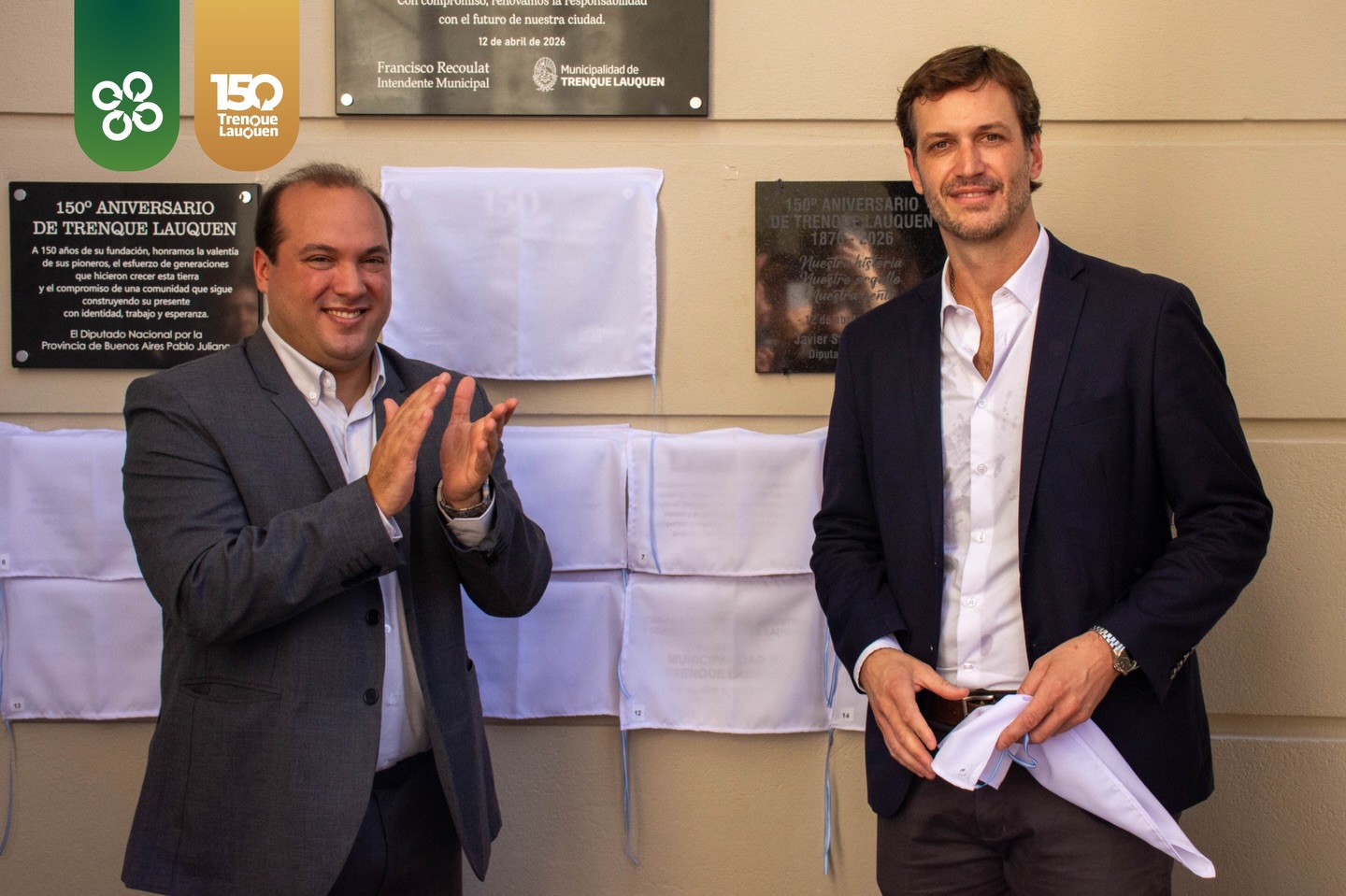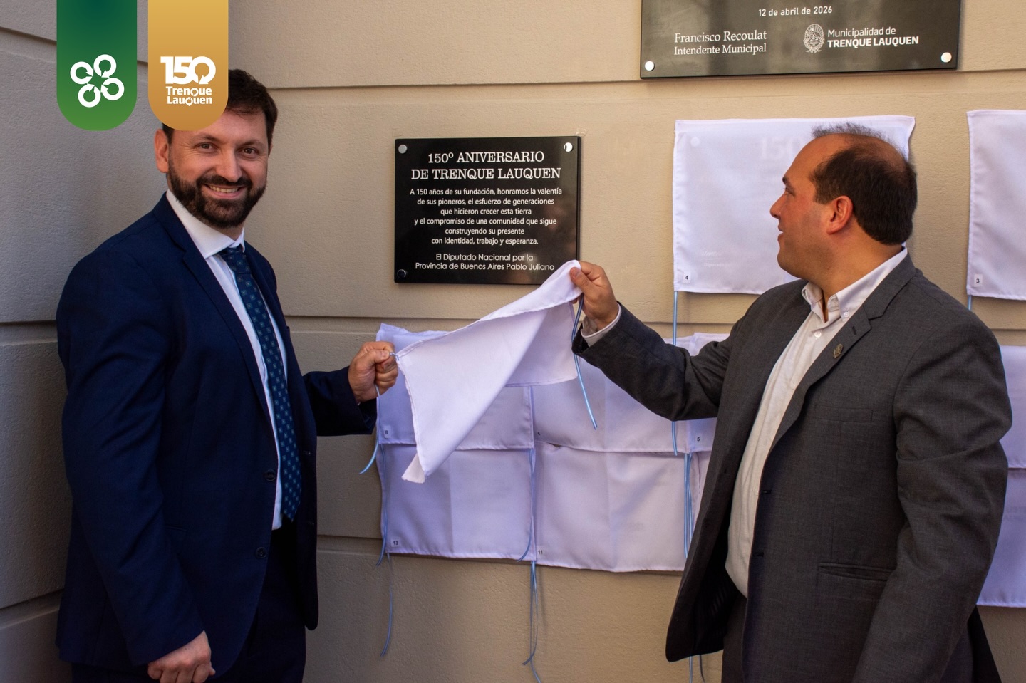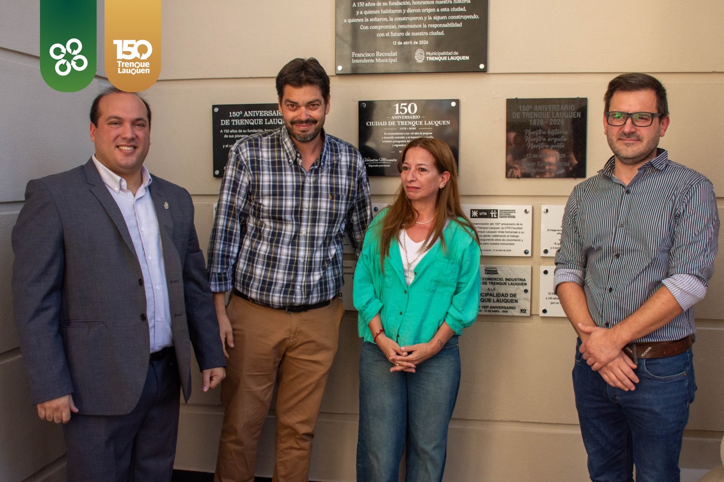 Las placas. La primera la de la Municipalidad de Trenque Lauquen, que dice “A 150 años de su fundación, honramos nuestra historia y a quienes habitaron y dieron origen a esta ciudad, a quienes la soñaron, la construyeron y la siguen construyendo. Con compromiso, renovamos la responsabilidad con el futuro de nuestra ciudad”.