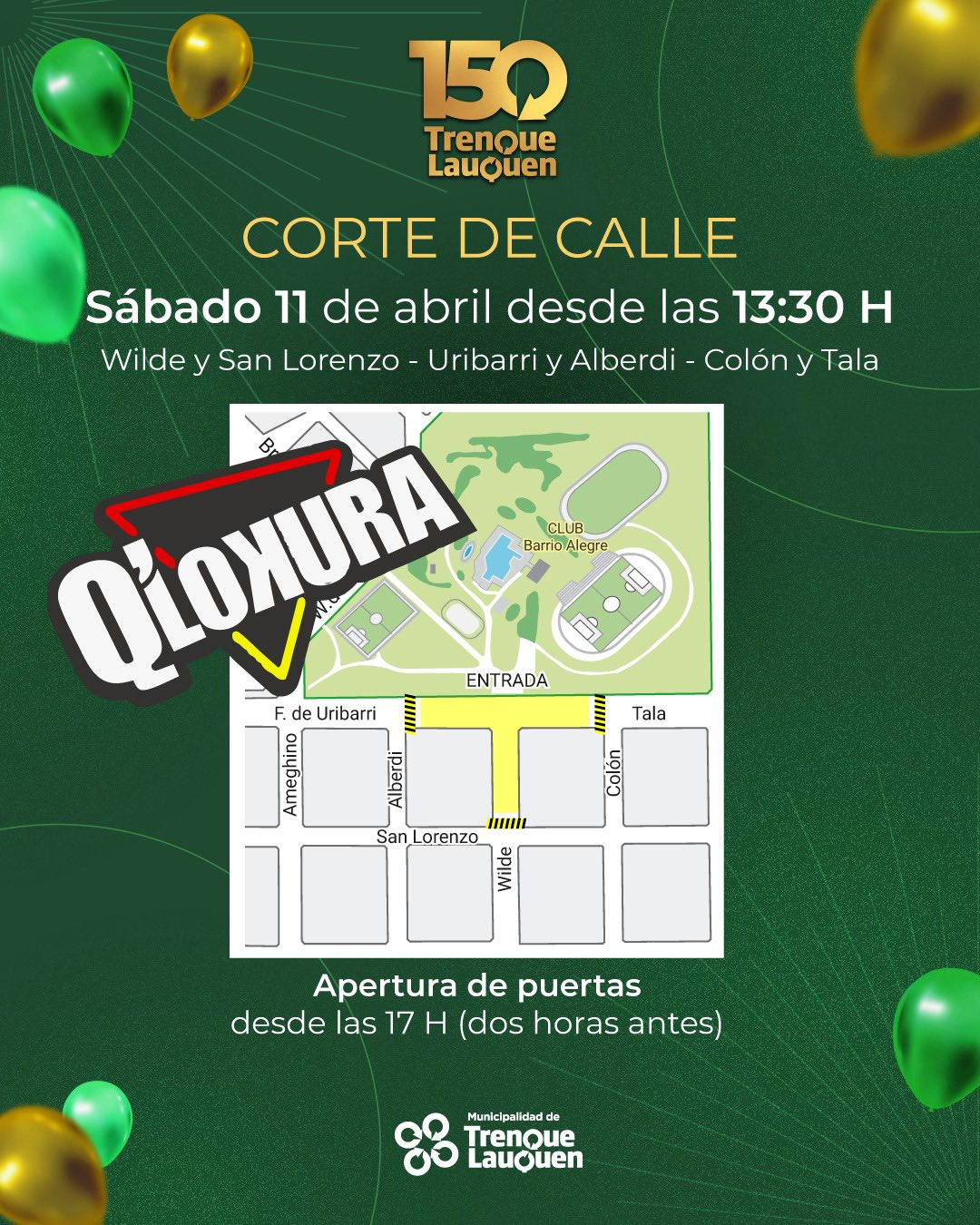Presentación de Q’ Lokura, con entrada libre y gratuita, en la cancha del Club Barrio Alegre a partir de las 19 h. La previa del show estará a cargo del reconocido locutor Juani Martínez, quien volverá a Trenque Lauquen para compartir con el público y presentar el show central del aniversario.