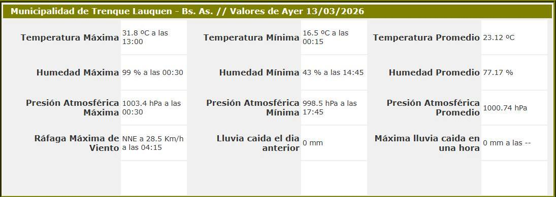 El viernes en #TrenqueLauquen: 31.8° la máxima, a las 13 horas. El promedio de la humedad, alto. Soplaron ráfagas de hasta 28.5 kilómetros por hora.