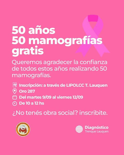 Lipolcc Trenque Lauquen extendió hasta el próximo viernes la inscripción para quienes no cuenten con obra social y quieran realizarse una mamografía en forma gratuita, en el marco de una acción solidaria que impulsan con Centro de Diagnóstico Trenque Lauquen, por el 50º aniversario de su fundación.