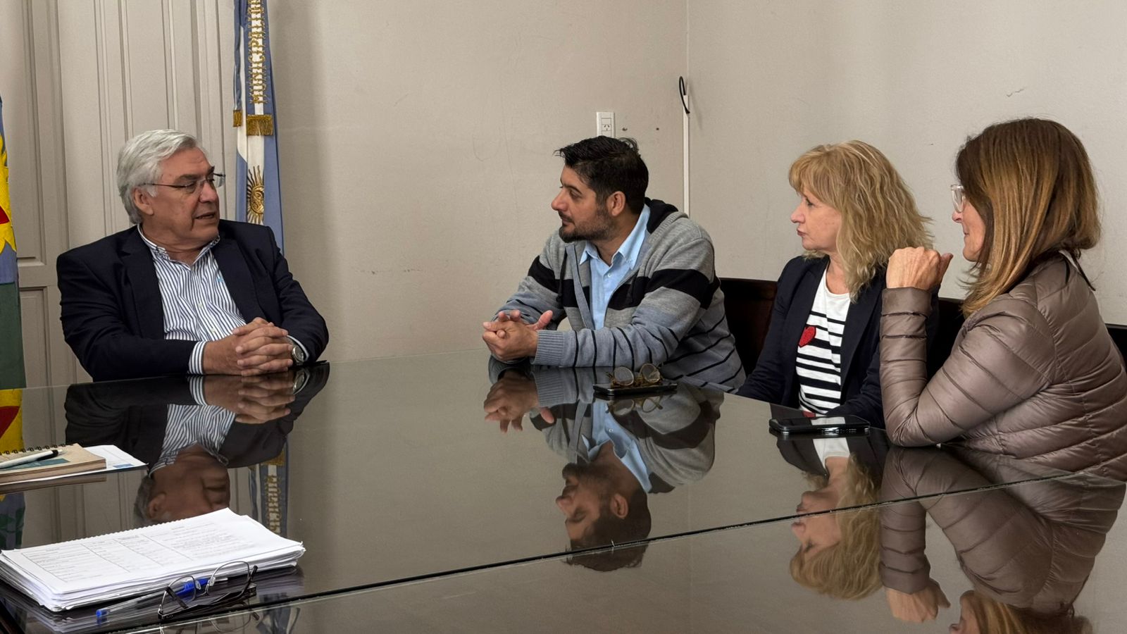 El intendente Gilberto Alegre, junto a la secretaria de Promoción, Producción y Medio Ambiente, Mónica Spertino, y la secretaria de Obras Públicas, Alejandra Matellán, se reunió con técnicos del Ministerio de Ambiente de la Provincia de Buenos Aires