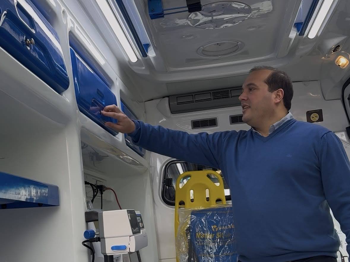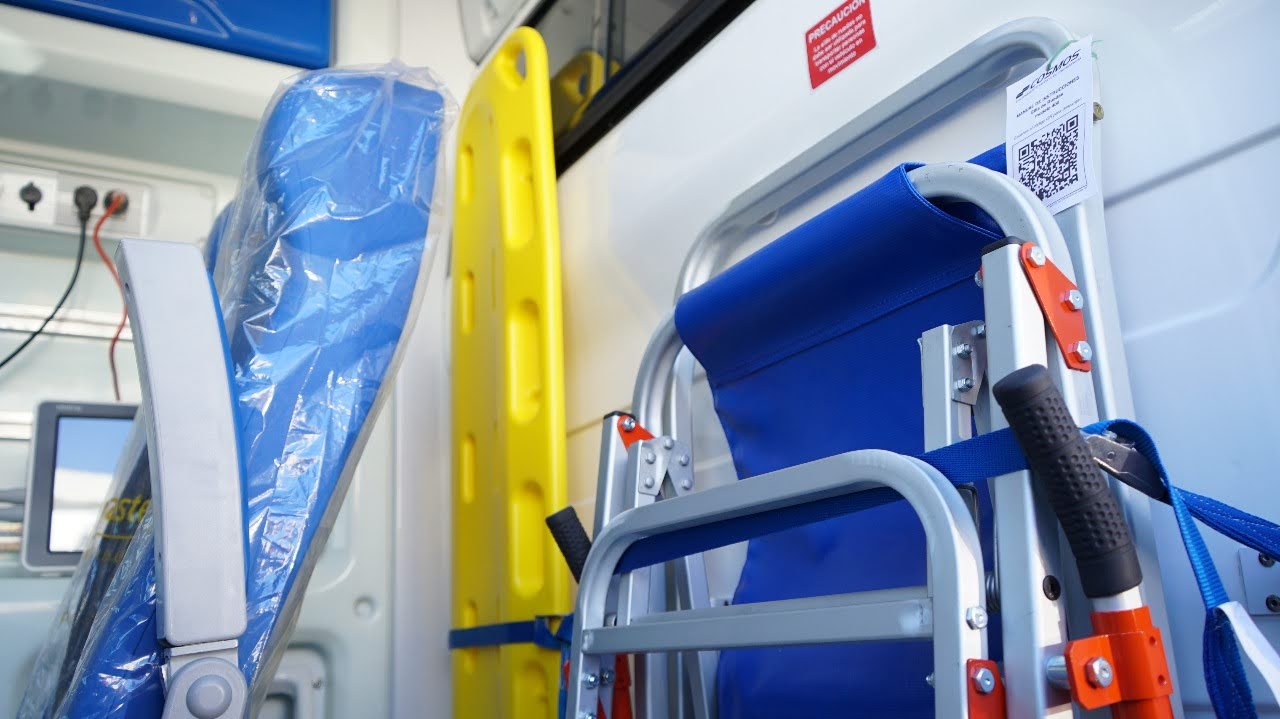 El vehículo, marca Mercedes Benz modelo Sprinter Furgón, cuenta con un electrocardiógrafo, dos bombas de infusión, dos tubos de oxígeno, un desfibrilador, un respirador de traslado, un monitor multiparamétrico, un aspirador, camilla, silla de ruedas y sistema de radio para comunicación, entre otros elementos para atender situaciones de trauma y urgencias.
