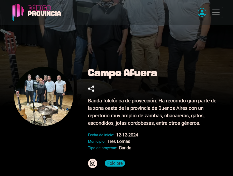 Luego de gestiones realizadas por el Secretario General de la Presidencia de la Cámara de Diputados de la Provincia David Alcalá y el presidente del PJ local Vasco Uriarte, la banda treslomense Campo Afuera comienza a formar parte de “Código Provincia”, un conglomerado de artistas del Instituto Cultural Provincial.