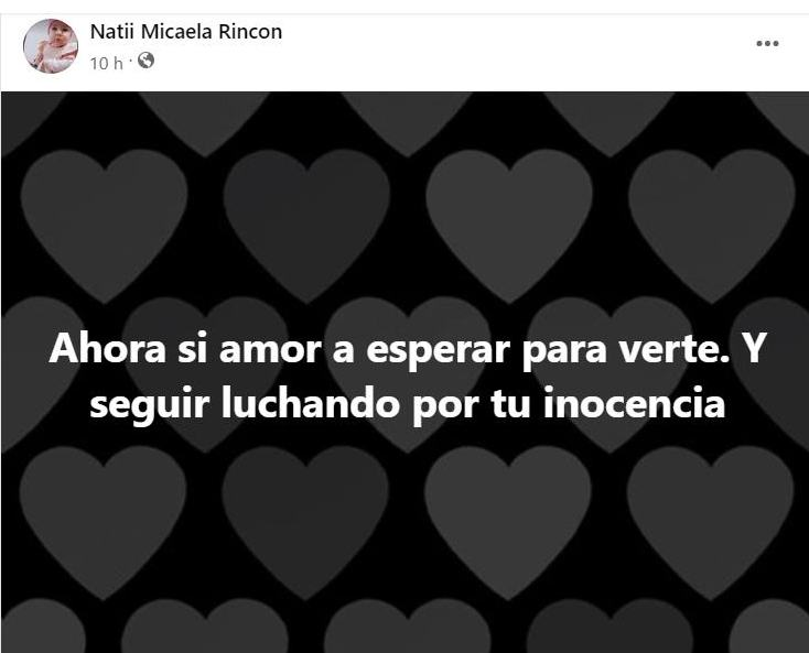 Natalia Micaela Rincón que postea en Facebook todos sus movimientos ante la Justicia ha pedido que le acerquen filmaciones, si existen, de su pareja circulando en bicicleta a la hora que se habría producido el asesinato de Anita. Este miércoles publicó varios donde se refiere a un viaje a América, con el fin de visitar a Pereyra que se encuentra en los calabozos de la comisaría de esa ciudad, la capital del distrito de Rivadavia.