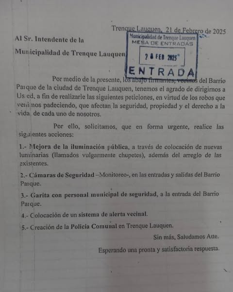 Familias del Barrio Parque de Trenque Lauquen presentaron notas solicitando mayor seguridad e informes sobre las denuncias elevadas por robo...