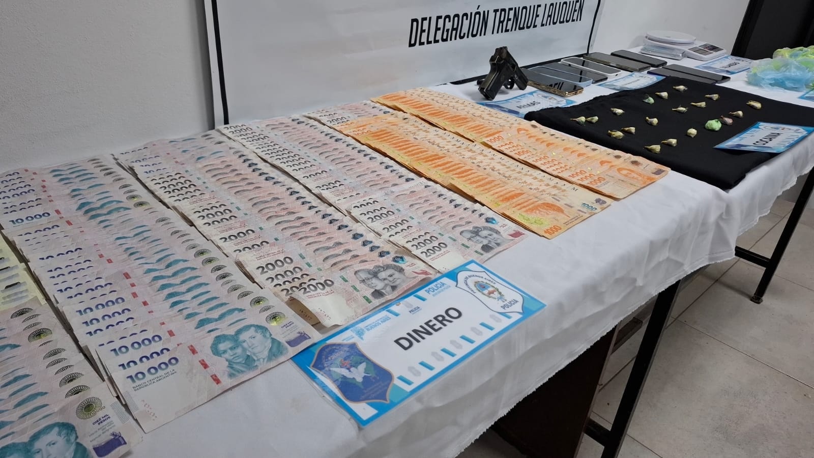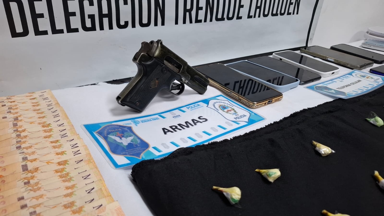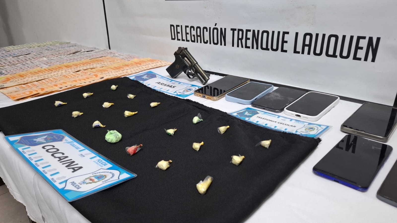Fue secuestrada una importante cantidad de dosis de clorhidrato de cocaína, listas para ser comercializadas a potenciales clientes, la suma total de $6.869.000 pesos, 16 teléfonos celulares, tres balanzas digitales, un arma de fuego, tipo revolver con numeración suprimida, elementos varios para el fraccionamiento y acondicionamiento de la sustancia ilícita para su comercialización, un rodado marca Volkswagen modelo, Bora, un rodado marca Volkswagen modelo Vento, y tres motocicletas marca Honda modelo tornado 250 cm3, de las cuales dos ellas poseían pedido de secuestro activo, por el delito de Robo/Hurto de la ciudad de Tandil.