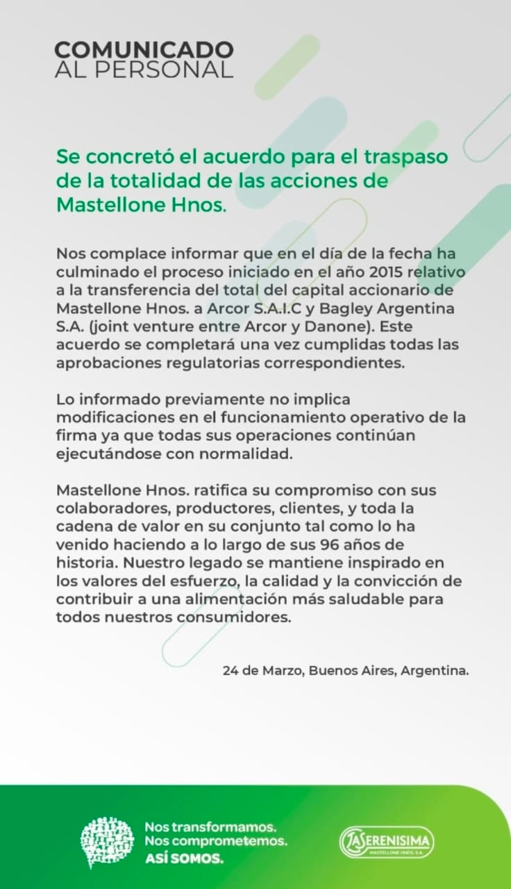 El grupo argentino Arcor y la multinacional francesa Danone (socios desde 2016 en Bagley) anunciaron este martes que se quedan con la totalidad de Mastellone Hnos. Obvian señalar los fuertes encontronazos públicos que mantuvieron el año anterior, replicándose en todos los medios del país e incluso del exterior. La compañía que tiene en Trenque Lauquen una de sus plantas más grandes de América Latina, venía recibiendo en los últimos tiempos la constante visita de Flavio Mastellone hijo de Victorio Mastellone, sobrino del recordado Pascual, que se desempeñaba como director de la compañía y de notoria influencia en las decisiones.