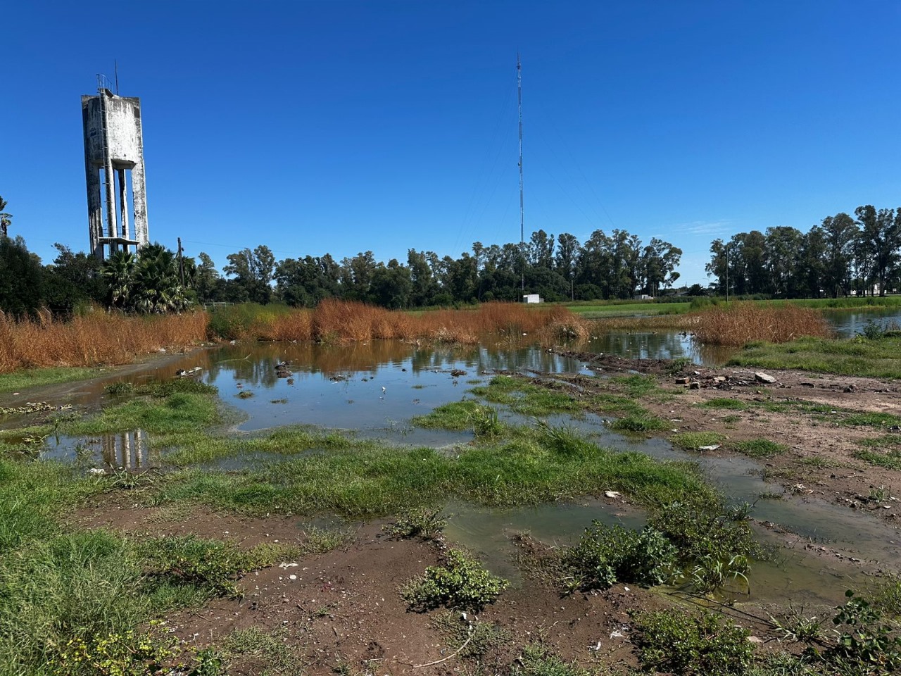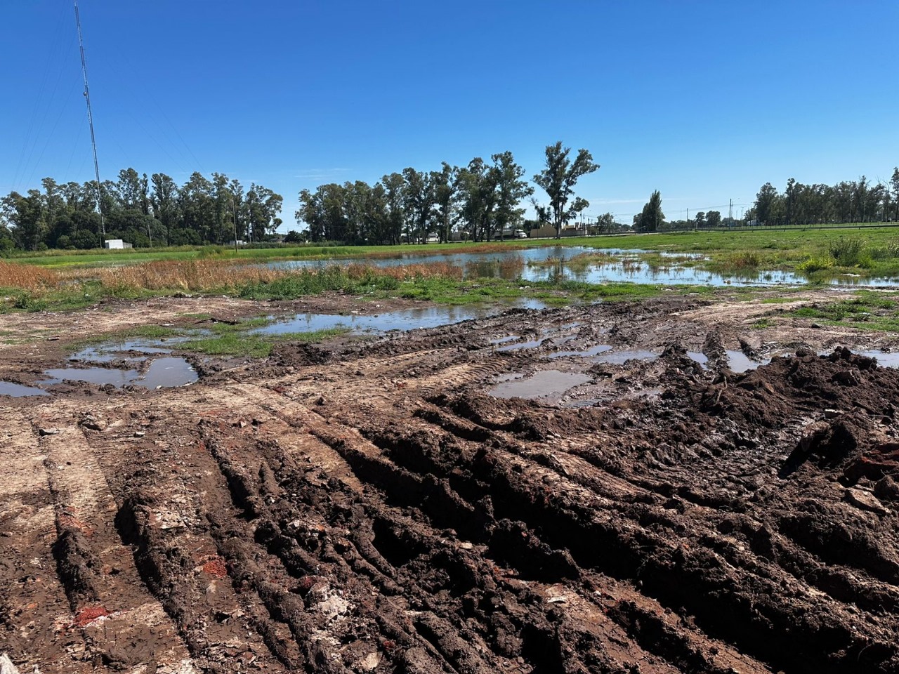 En el escrito se informa que, en el predio municipal lindero a la entrada de la Planta depuradora de Aguas Bonaerenses S.A., hay una gran inundación producto de filtraciones de la planta. Atento estar el predio cubierto de agua en su mayoría, imposibilita que los camiones atmosféricos puedan descargar en el piletón creado por el Municipio a tal efecto, por falta de estabilidad en el suelo.