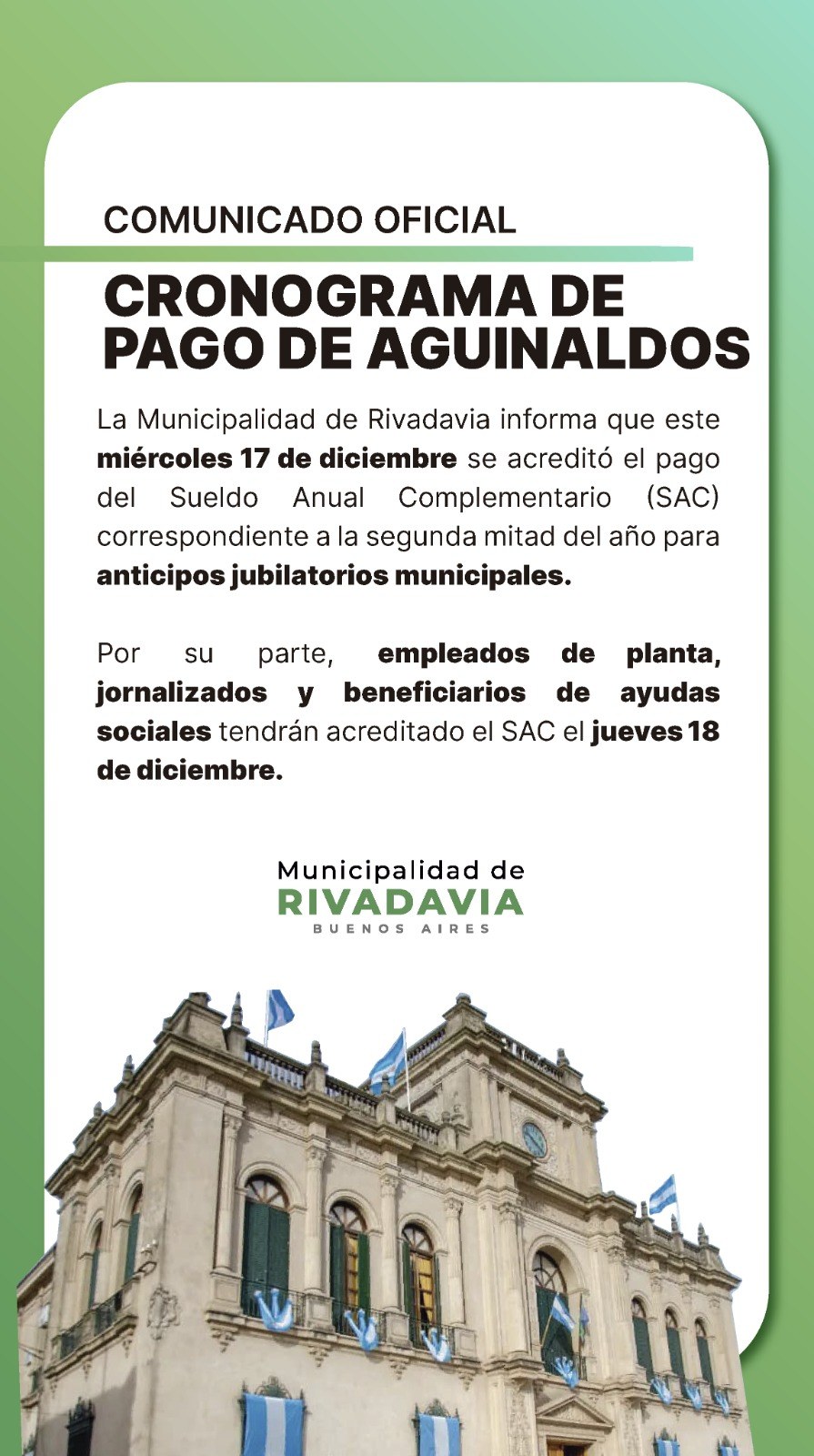 El municipio de Rivadavia acredita entre este miércoles y jueves el Sueldo Anual Complementario