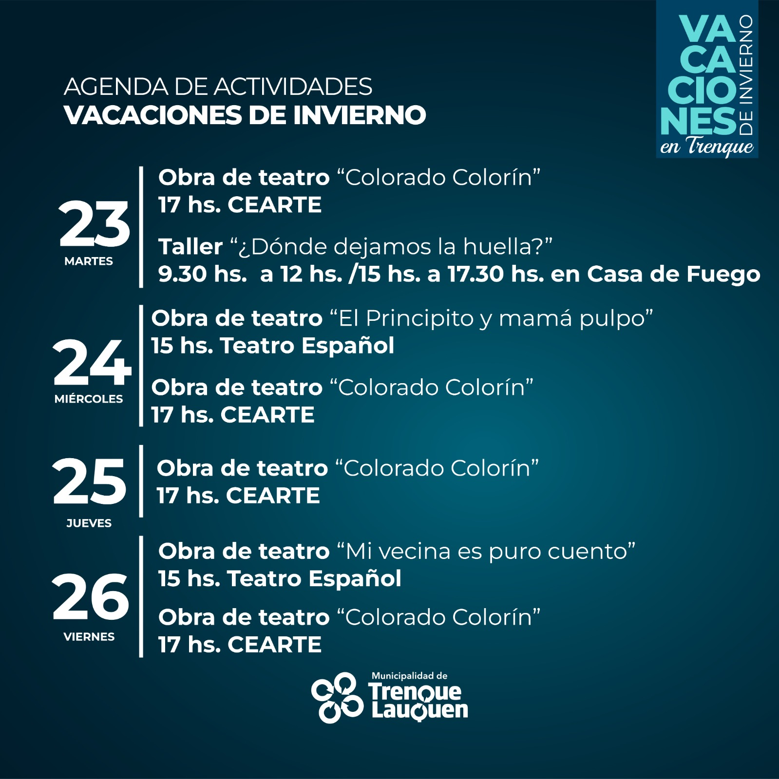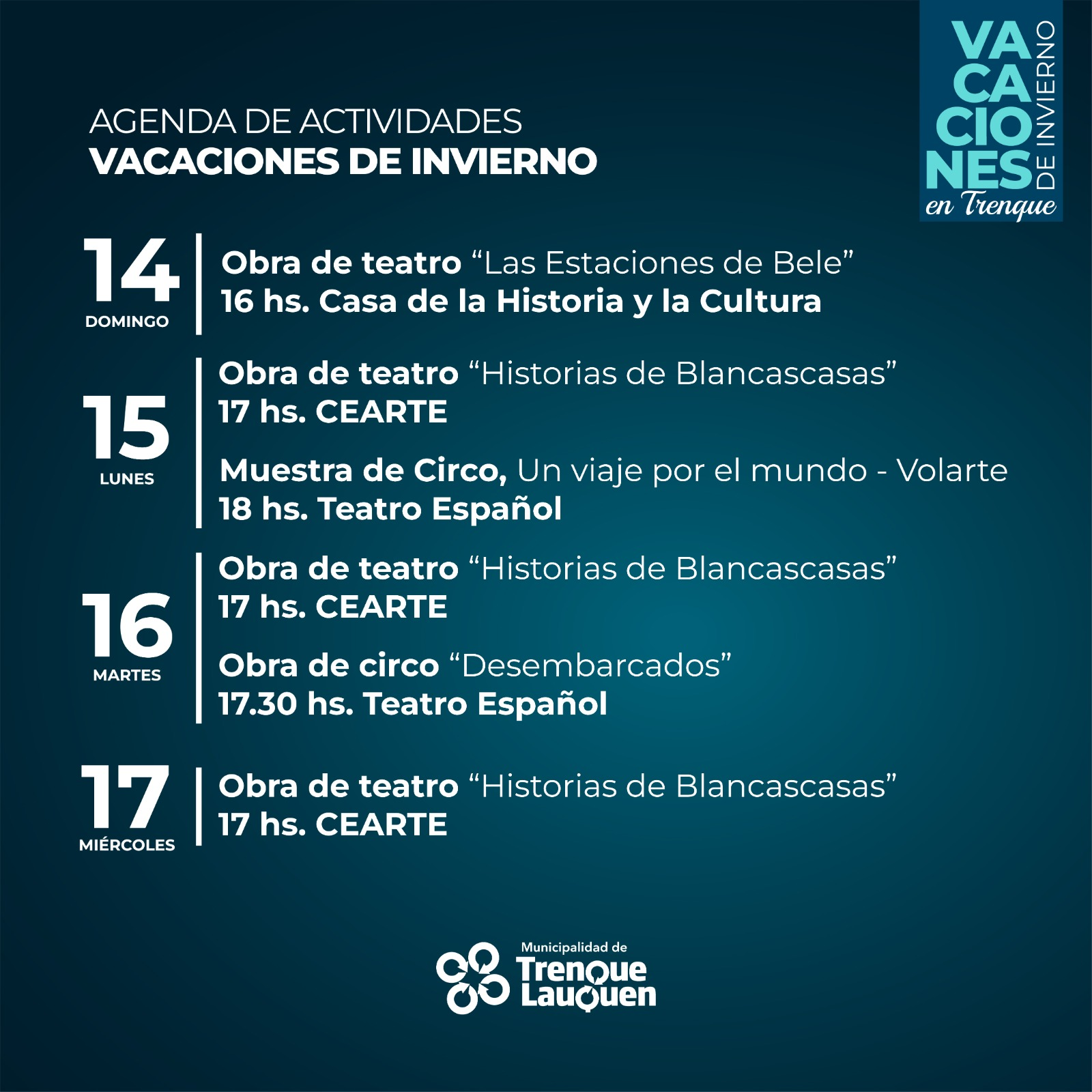 Un amplio programa de actividades, que incluye obras de teatro, muestra de circo y talleres, durante las vacaciones de invierno en Trenque Lauquen, con la organización y el patrocinio del municipio, se desarrollará desde el domingo (14) hasta el viernes 26 del corriente, en distintas sedes municipales y espacios privados.