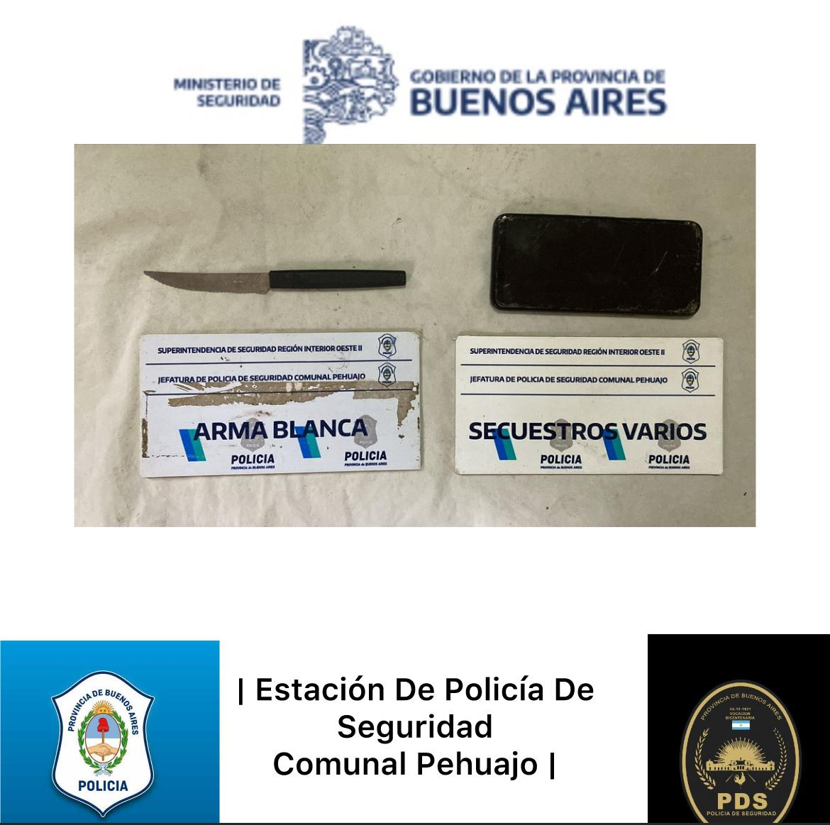 Las autoridades policiales procedieron en el lugar al secuestro de un cuchillo tipo serrucho color negro, y telefonía celular.