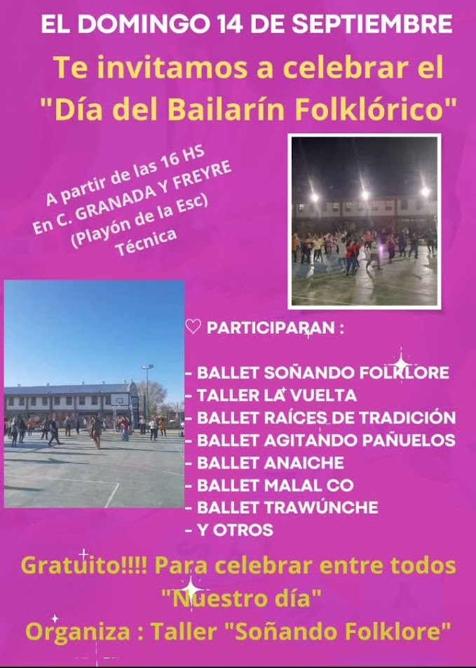 El taller de danza “Soñando Folklore” que se dicta en el CIC del Barrio Esperanza a cargo de la profesora Natalia Moreira, con colaboración del Municipio, organiza el festejo del Día del Bailarín folklórico, que será este domingo a partir de las 16 en el Playón de la Escuela Técnica (Carmen Granada y Freyre).