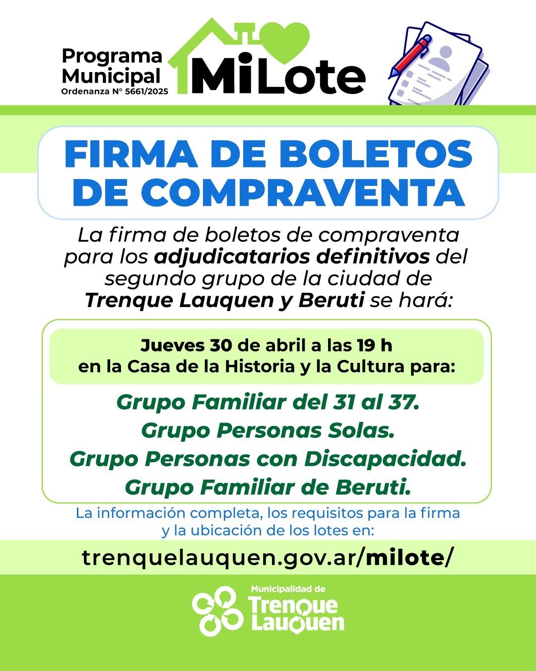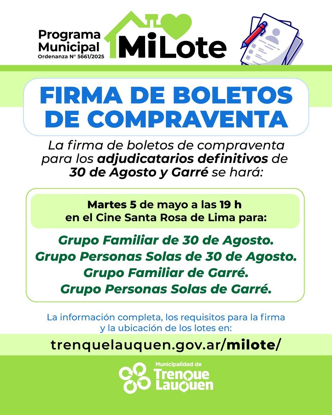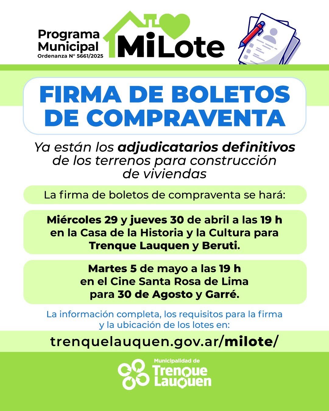 Este miércoles primer acto de firma de boletos de compraventa para adjudicatarios de terrenos del programa “Mi Lote”, en Trenque Lauquen
