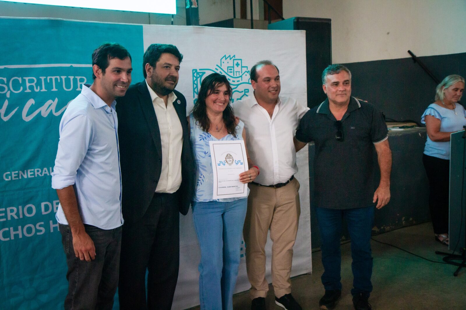 Después de los discursos se realizó la entrega protocolar de escrituras a las siguientes familias beneficiarias: Juan José Napoleón Lobo – María Andrea Rizzardi, Juan Marcial Cavanna, Julián Elías López –Yanel Martina Santa Eulalia, Miguel Federico Araneo-Gisela Micaela Di Bin, Lucas José Lacrouts-Gabriela Soledad Lucena, y Mónica Adriana Aparicio-Juan Daniel Neiser. También recibieron sus escrituras: Mónica Adriana Ruiz, María Fernanda Corral-Guillermo Germán Trionfetti, Carmen Edith Pérez-Jorge Luis Sosa y Hugo Orlando Díaz-Marcia Andrea Gallaratti.