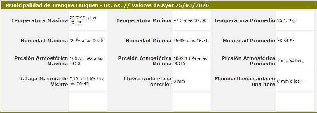 Como se comportó el clima ayer en #TrenqueLauquen. La temperatura máxima 25.7°, hubo ráfagas intensas de viento del sector SUR alcanzando los 41 km por hora, a la madrugada