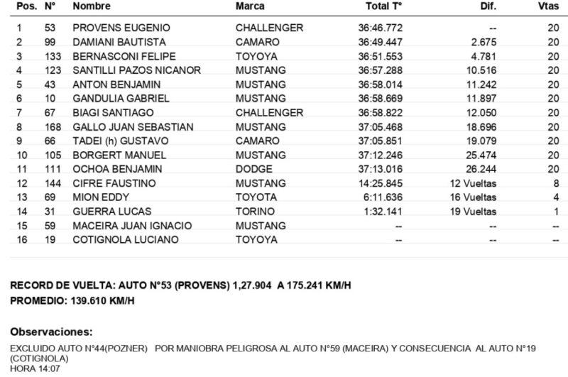 El trenquelauquense Felipe Bernasconi (Toyota Camry) superó a Nicanor Santilli Pazos (Ford Mustang) en la reanudación posterior al primer auto de seguridad y completó el “top 3”, en lo que fue su 2º podio consecutivo.