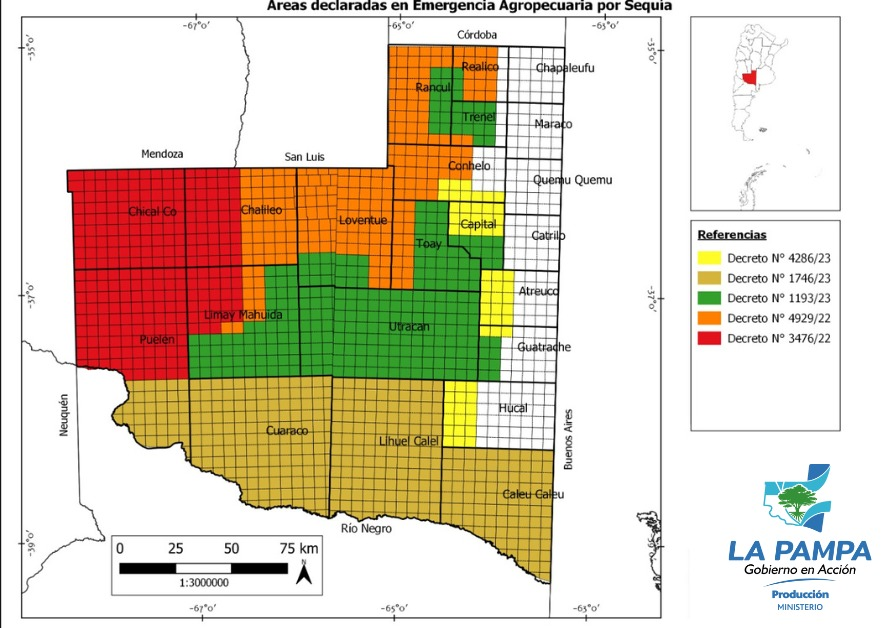 De acuerdo a lo que se dio a conocer oficialmente, el gobernador Sergio Ziliotto «aprobó la continuidad del estado de emergencia y desastre agropecuario como consecuencia de la sequía en la totalidad de los departamentos de Rancul, Toay, Capital, Loventue, Chalileo, Chical Có, Puelén, Limay Mahuida, Curacó, Lihuel Calel, Caleu Caleu y parte de Realicó, Trenel, Conhelo y Guatraché. Asimismo, declaró la misma para parte de los departamentos Conhelo, Atreucó, Guatraché y Hucal».