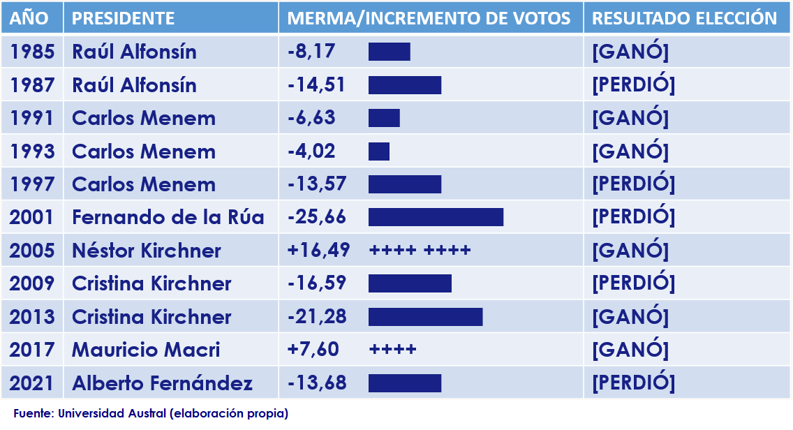 Por el contrario, los descensos más drásticos fueron los de Fernando de la Rúa en 2001 (-25,6%) y Cristina Fernández de Kirchner en 2013 (-21,3%). El informe remarca que, en promedio, la pérdida de votos de los oficialismos en elecciones de medio término ronda los 13,8 puntos porcentuales, y que cada vez que la oposición aumentó su caudal respecto a la elección presidencial, anticipó un cambio de gobierno.