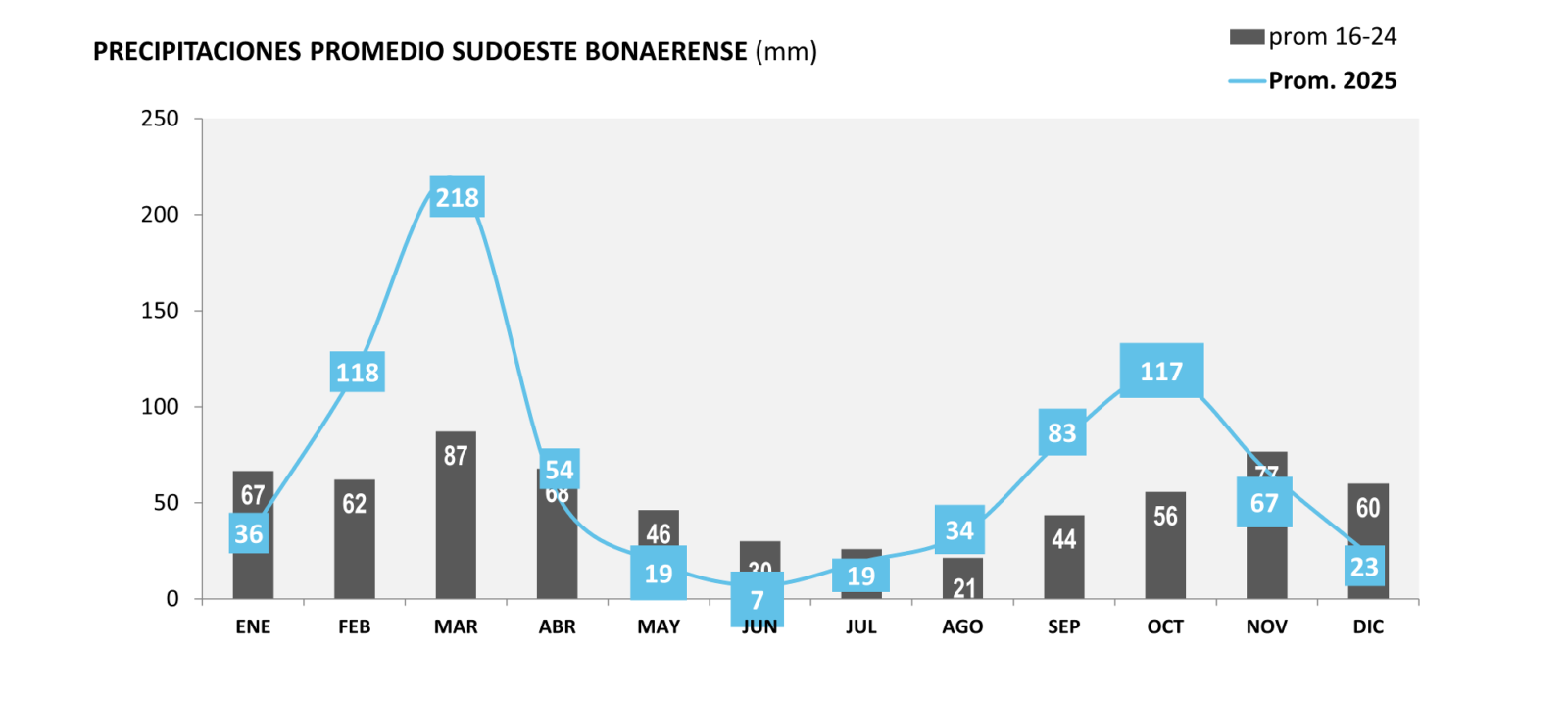 Hacia finales de año, las precipitaciones se redujeron considerablemente en nuestra región. Esto retrasó la siembra de gruesa en las localidades que ya presentaban cierto déficit hídrico, como en los partidos de la zona sur y de La Pampa; en cambio, aquellos con mayor reserva hídrica lograron buena implantación y rápido crecimiento desde la siembra. La necesidad de nuevas lluvias se intensifica con una mayor cantidad de días con temperaturas por encima de los 30° C y fuertes vientos.