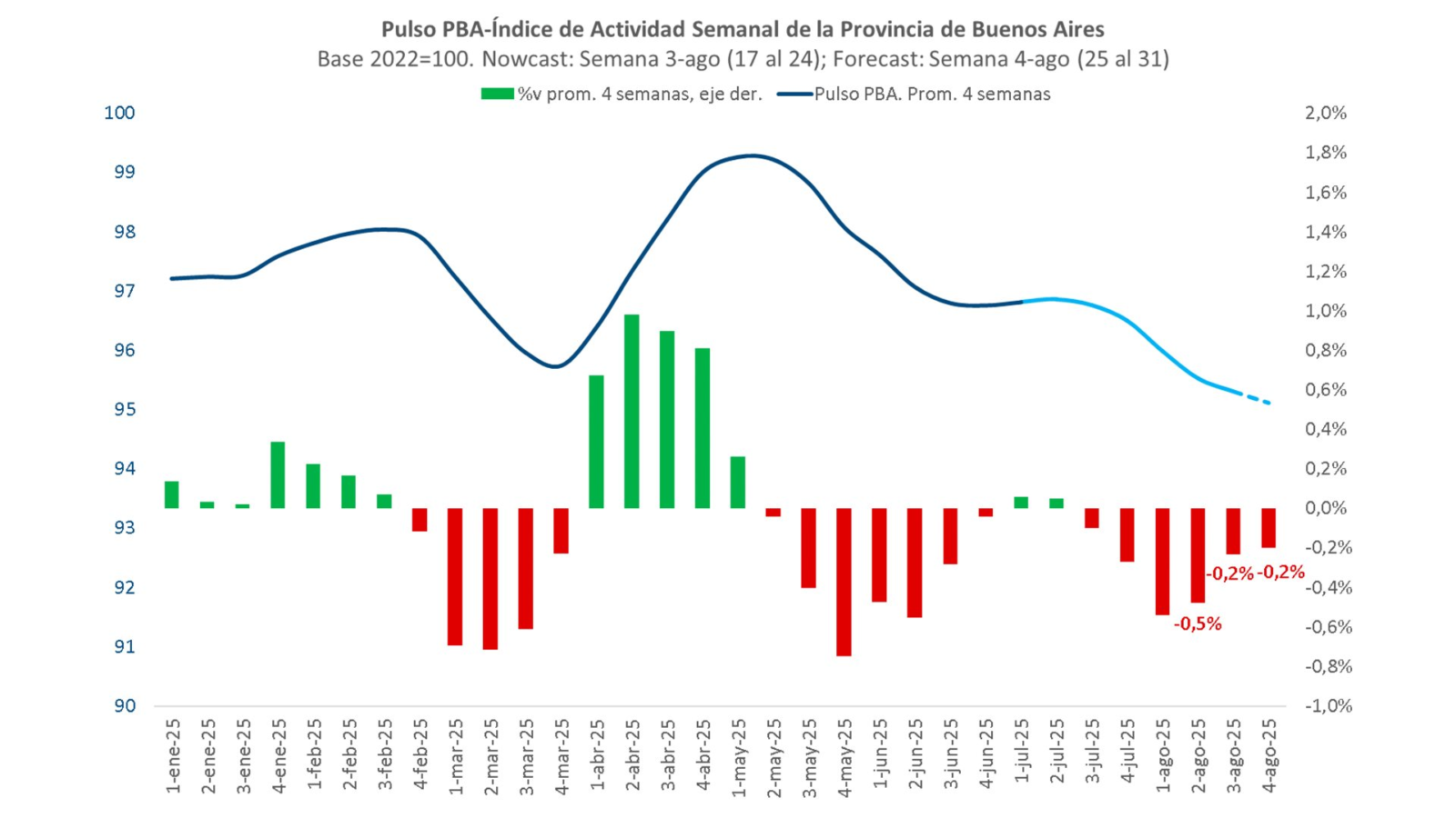 El índice Pulso PBA, que se construye con más de 1.200 datos diarios y un algoritmo de inteligencia artificial, mostró una caída de la actividad del 0,3% en julio y del 1,4% en agosto. “La tendencia es recesiva y no muestra signos de mejora en el corto plazo”, advirtió Cuattromo.
