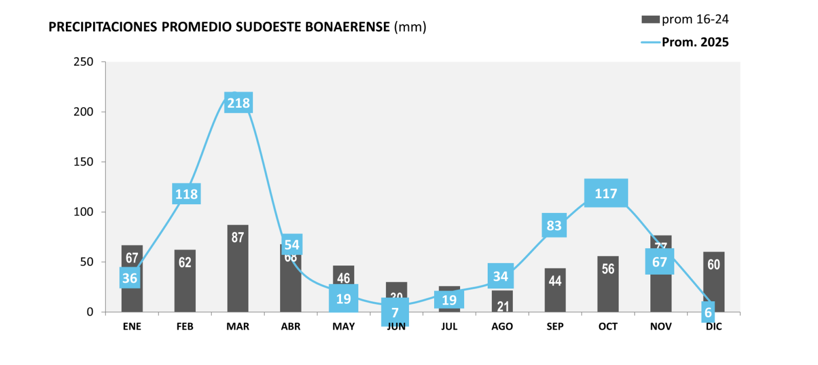 Por su parte las precipitaciones en el sudoeste bonaerense fueron prácticamente nulas, con un promedio de apenas 6 mm. Mientras que el acumulado anual hasta el momento asciende a 778 mm, superando ampliamente el promedio histórico de 644 mm.