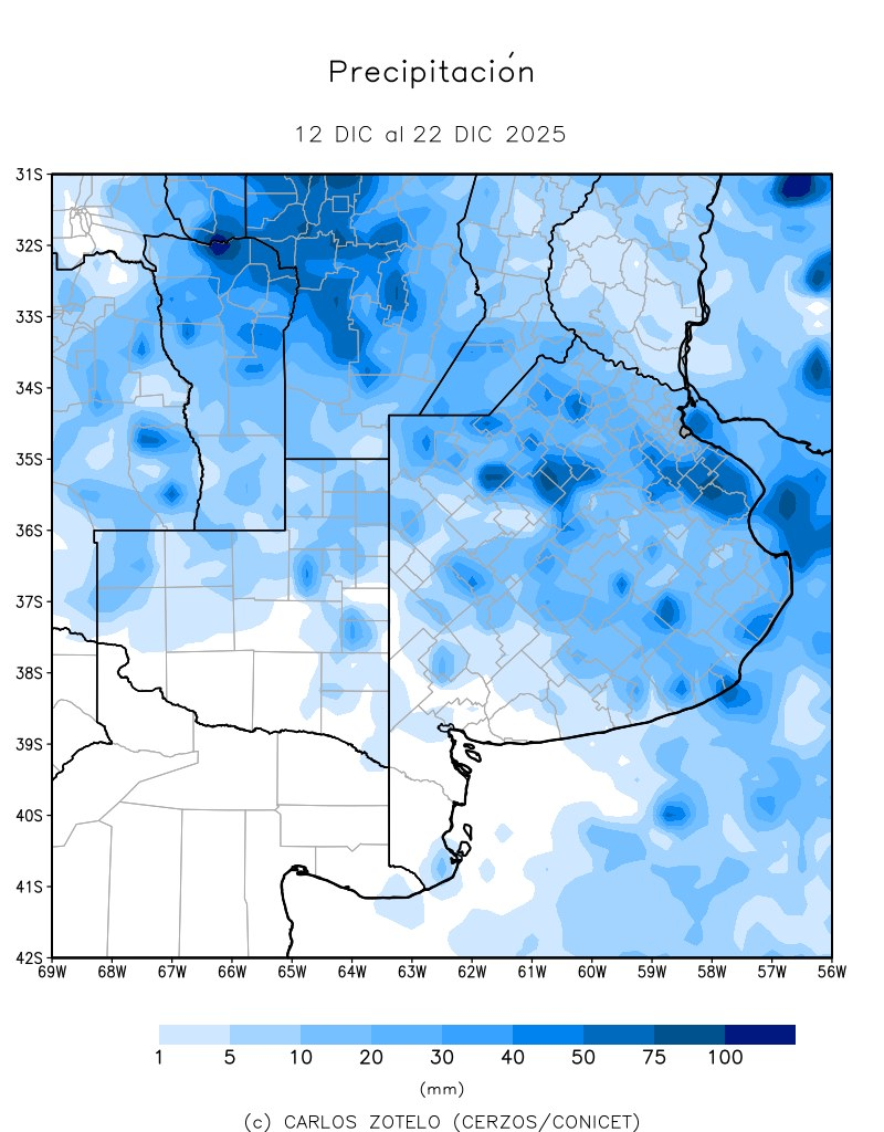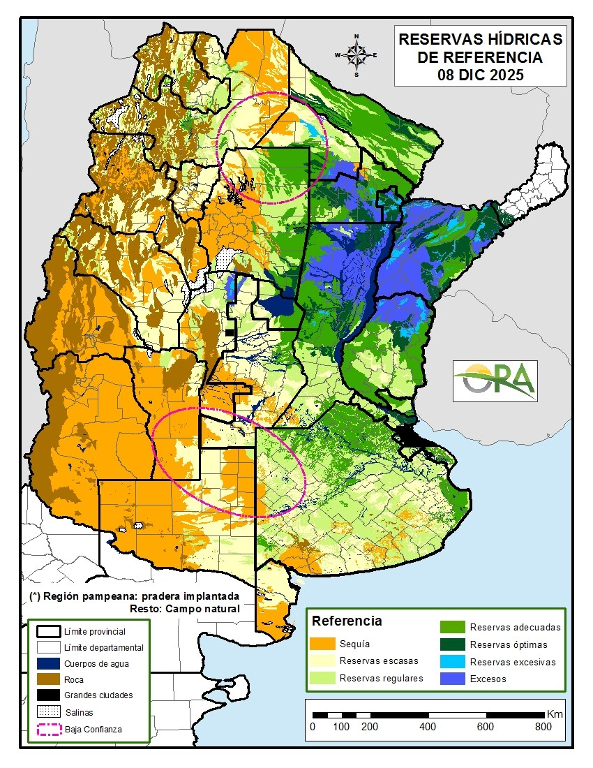 Las menores precipitaciones registradas en noviembre y lo transcurrido de diciembre, sumado al incremento de la temperatura propio del período, han generado una disminución generalizada de las reservas hídricas. Esta situación dio lugar a áreas con condiciones de sequía tanto en el norte pampeano como en sectores del sur bonaerense. En contraste, el este provincial transita diciembre con perfiles hídricos más favorables, lo que aporta mayor estabilidad al desarrollo de la campaña.