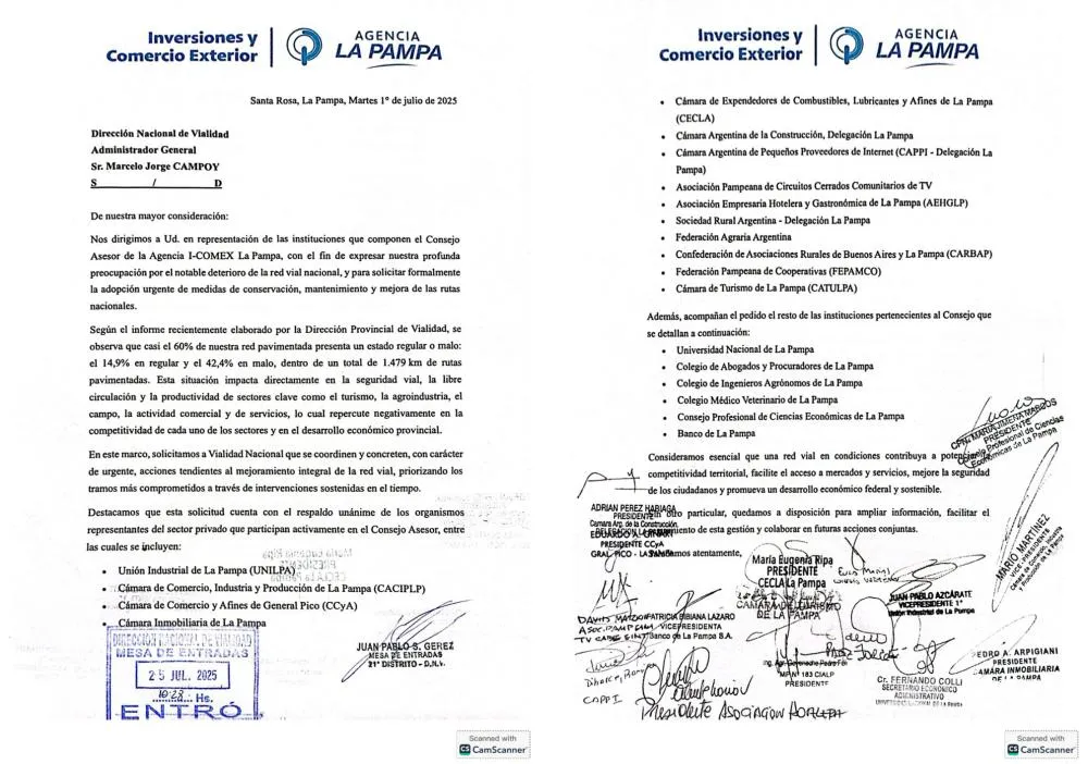 El director de la Agencia I-Comex, Sebastián Lastiri, entregó un petitorio a las autoridades de Vialidad Nacional (las que queden) donde piden por la reparación de las rutas nacionales. El reclamo cuenta con el respaldo de catorce cámaras empresariales, la Universidad Nacional de La Pampa (UNLPam) y cuatro colegios profesionales.