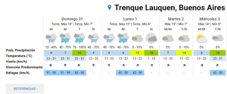 El informe de las primeras horas de este domingo estima altas posibilidades de lluvia entre la media mañana y mediodía con viento fuerte de hasta 50 kilómetros por hora. Para el lunes, la lluvia se daría hasta después del mediodía, también con estimación de vientos intensos.