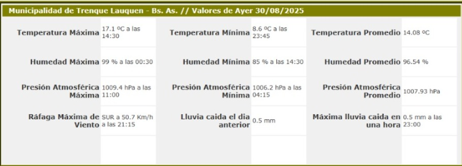 El sábado se registraron vientos fuertes de hasta 50.7 kilómetros por hora del sector sur, en horas de la noche, con una temperatura máxima que llegó a los 17.1 grados y la mínima sobre la culminación del día, 8.6 grados.
