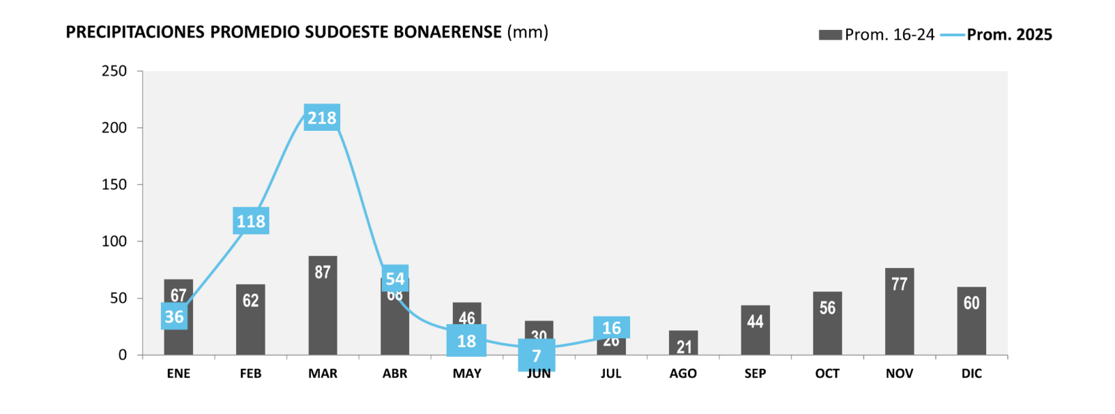 A los 24 días del mes de Julio, la Red de Estaciones Meteorológicas (REM) de la BCP registró un promedio de 16 mm en el sudoeste bonaerense.