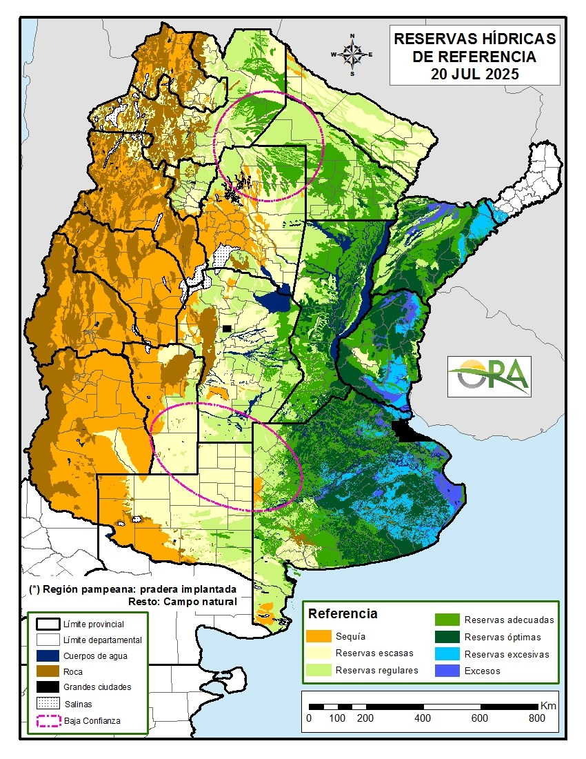 Se observa una marcada diferencia en la reserva hídrica entre el este y oeste de la región de estudio. Esta disparidad se da principalmente por las precipitaciones recibidas y también por la distinta capacidad de los suelos para almacenar agua.