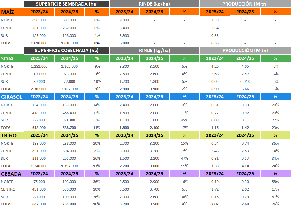 En zona sur donde predominan los esquemas tardíos, se estima que ya se cosechó un 35% de la superficie destinada a la gramínea. Los rendimientos obtenidos se ubican dentro de la media zonal de 3.000 kg/ha. Algunos lotes afectados por la sequía fueron destinados a consumo animal.