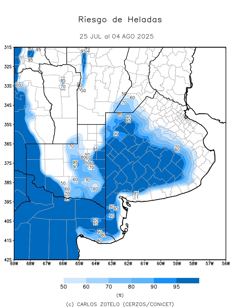 Se esperan precipitaciones de entre 30 y 40 mm en algunas áreas de la provincia de Buenos Aires. Asimismo, se mantiene un alto riesgo de heladas (95%) especialmente sobre el centro del territorio bonaerense.