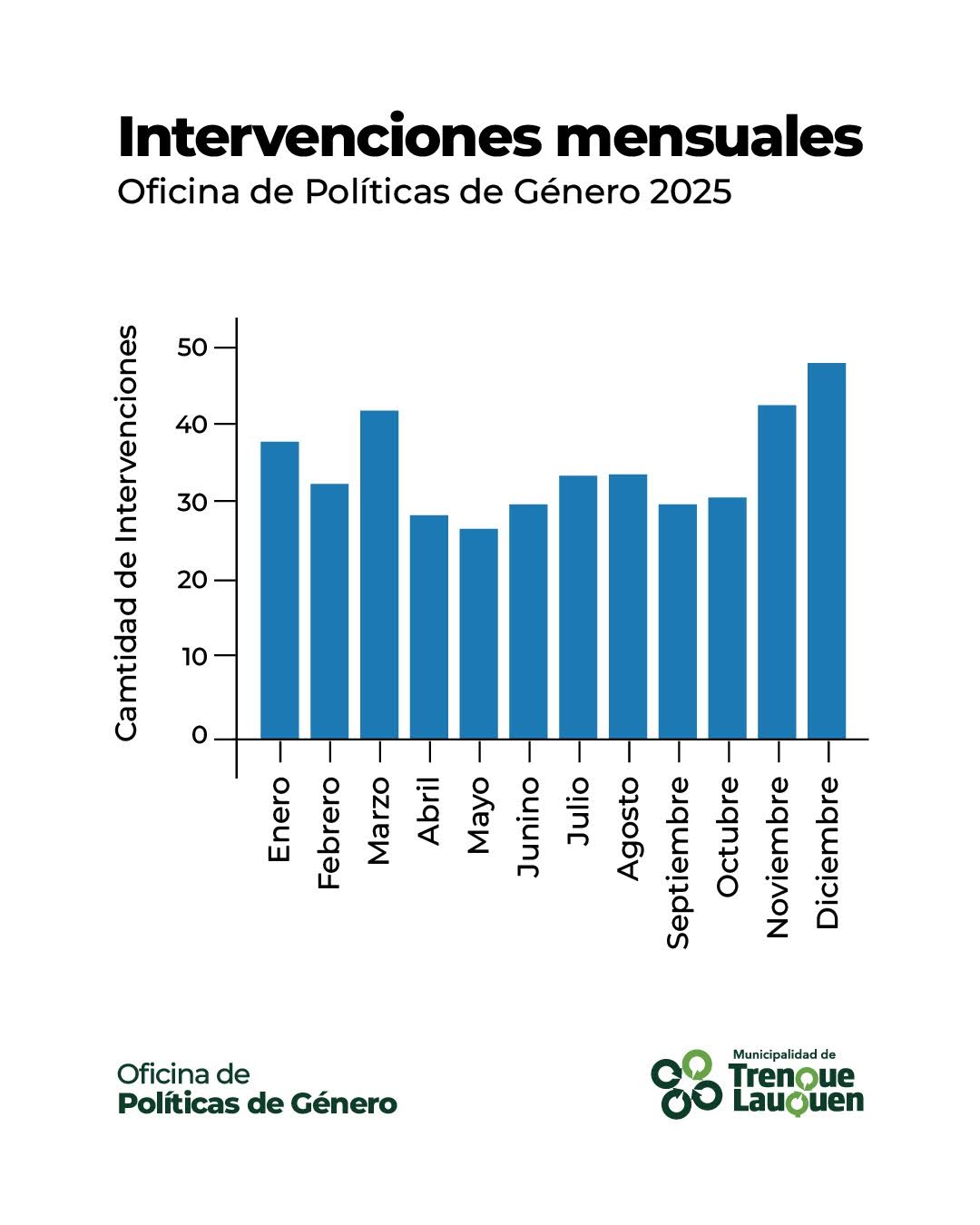 Un total 419 intervenciones tuvo la Oficina de Políticas de Género de la Municipalidad de Trenque Lauquen durante 2025 acompañando, asesorando y conteniendo en situaciones de violencia por razones de género: el promedio fue de 35 intervenciones por mes, siendo diciembre, el de mayor demanda: 47.