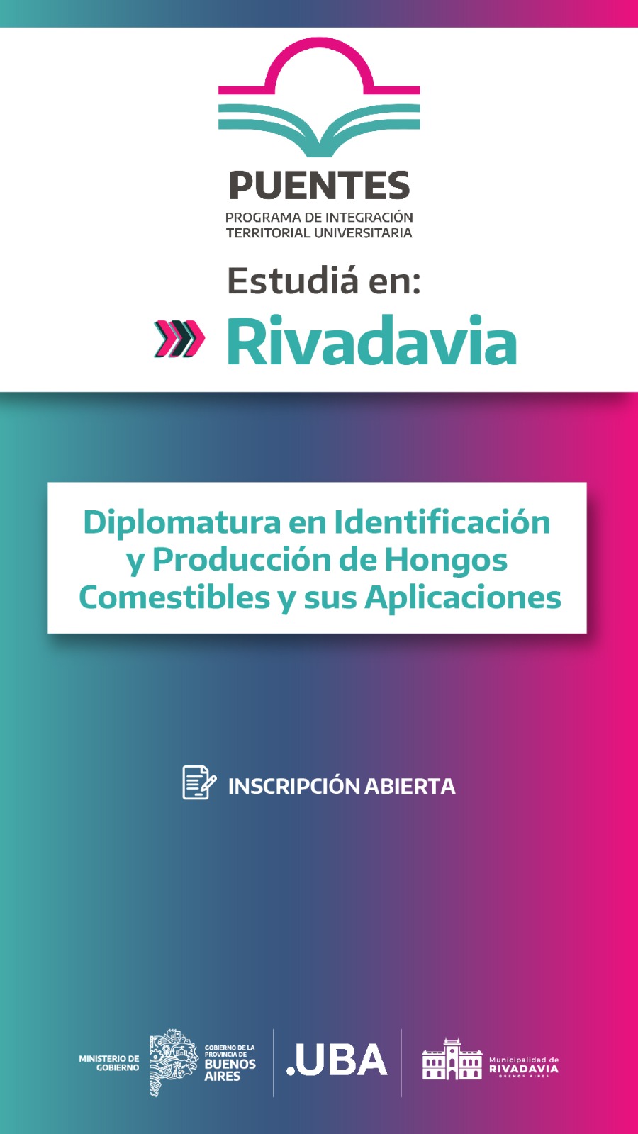 La Municipalidad de Rivadavia, a través del programa provincial PUENTES, incorpora una nueva oferta educativa para el nivel superior. Se trata de la Diplomatura en Identificación y Producción de Hongos Comestibles y su Aplicación, de la UBA.
