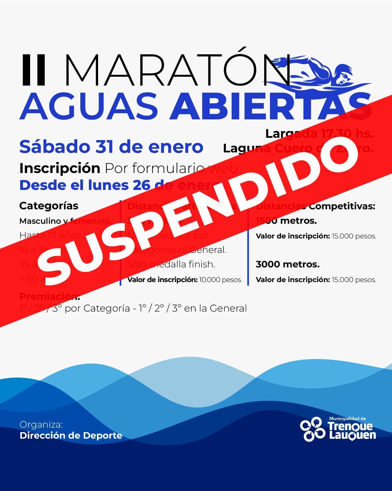 La II Maratón Aguas Abiertas fue suspendida por las condiciones de la laguna Cuero de Zorro, con el objetivo de cuidar la salud de los deportistas, a partir de la alerta naranja emitida por el Ministerio de Salud de la Provincia de Buenos Aires por la presencia de cianobacterias. Se iba a desarrollar este sábado.
