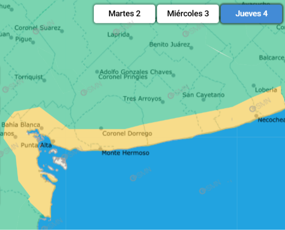 En tanto, a partir de las cero horas de este miércoles, el alerta solo incluye a la porción de la costa bonaerense entre los municipios de Villarino y Necochea, pasando por Bahía Blanca, Coronel Rosales, Coronel Dorrego, Monte Hermoso y Tres Arroyos.