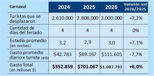 • Los números del Carnaval 2026 fueron récord histórico en cantidad de turistas. La mejor marca se había logrado en 2023, con 2.925.000 viajeros, y ocurre en un contexto económico de muchas restricciones de ingresos en las familias, lo que refuerza la importancia que tienen estas fechas en la población.