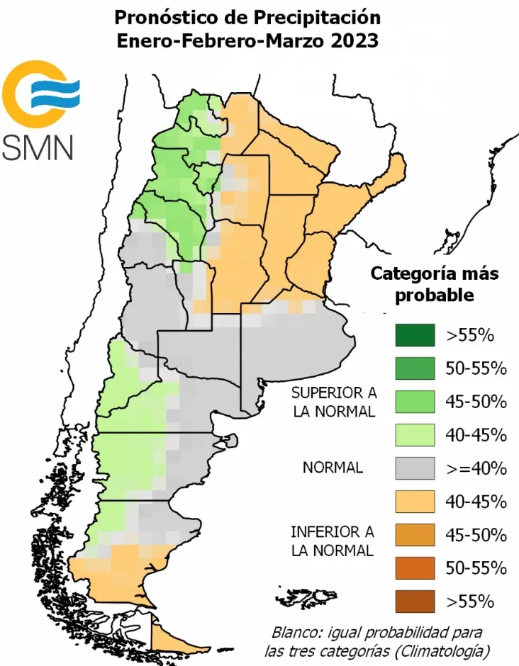 Para el primer trimestre del año 2023, las precipitaciones pueden ser normales o inferiores a las normales en el Litoral, norte y centro del país y sur de Patagonia. Además, hay una mayor probabilidad de que se registren lluvias dentro de la media en Cuyo, La Pampa, Buenos Aires y todo el este patagónico.
