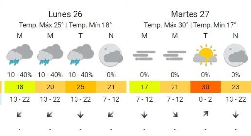 Estimación de lluvias para este lunes con temperatura máxima de 25°, y neblinas para la mañana del martes con temperatura en ascenso.