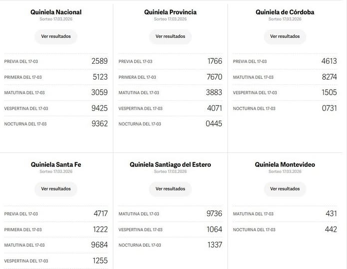Quinielas: Nacional, Provincia, Córdoba, Santa Fe, Santiago del Estero, Montevideo del 17 de marzo