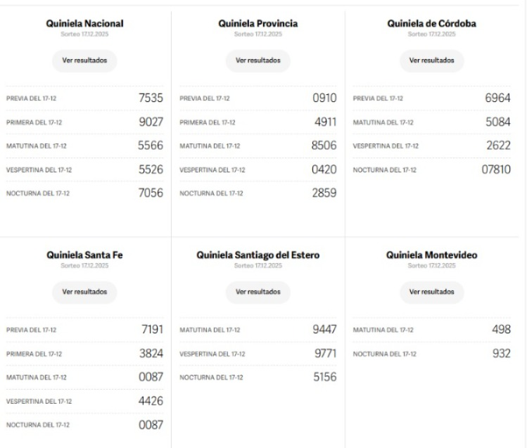 Quinielas: Nacional, Provincia, Córdoba, Santa Fe, Santiago del Estero, Montevideo del 17 de Noviembre