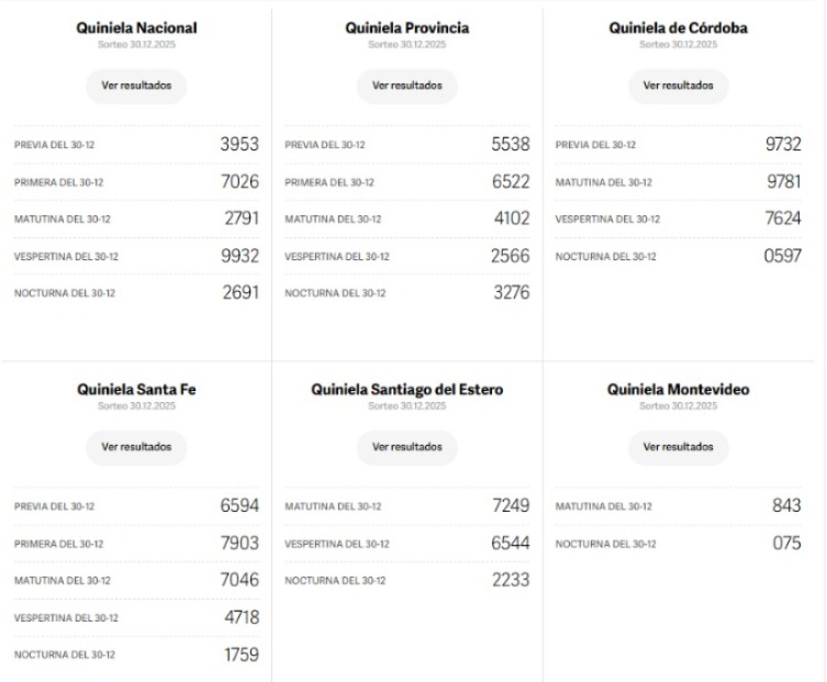 Quinielas: Nacional, Provincia, Córdoba, Santa Fe, Santiago del Estero, Montevideo del 30 de Diciembre