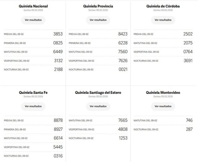 Quinielas: Nacional, Provincia, Córdoba, Santa Fe, Santiago del Estero, Montevideo del 9 de Febrero