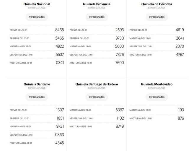 Quinielas: Nacional, Provincia, Córdoba, Santa Fe, Santiago del Estero, Montevideo del martes 13 de Enero