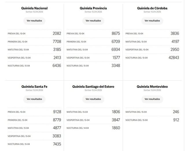 Sin categoría Quinielas: Nacional, Provincia, Córdoba, Santa Fe, Santiago del Estero y Montevideo del 15 de Abril 16 abril, 2026 64 Tags: Entretenimiento, POLÍTICA Más historias Sin categoría Quini 6: un nuevo súper millonario, al ganar 2.336 millones de pesos 16 abril, 2026 176 Sin categoría Fútbol Libertadores y Sudamericana: ganaron Independiente Rivadavia en el Maracaná, Rosario Central en Paraguay y River, perdió Racing 16 abril, 2026 109 Sin categoría Carta abierta de un jubilado a los partidos políticos y políticos argentinos: «construimos la Argentina que hoy Uds. gobiernan como si fuera sólo de ustedes» 15 abril, 2026 190 Sin categoría Encuesta nacional de Giacobbe & Asociados: Cuál fue el gobierno más corrupto desde la vuelta de la democracia ? 15 abril, 2026 193 Sin categoría Boca ganó 3 a 0 en la segunda fecha de la Conmebol Libertadores 2026 15 abril, 2026 230 Sin categoría Se realizan trabajos de reparación y mejora en las banquinas del kilómetro 213 de la Ruta Nacional 33, jurisdicción de Guaminí 15 abril, 2026 276