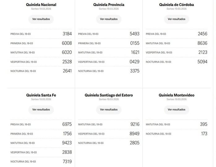 Quinielas: Nacional, Provincia, Córdoba, Santa Fe, Santiago del Estero y Montevideo del 19 de marzo