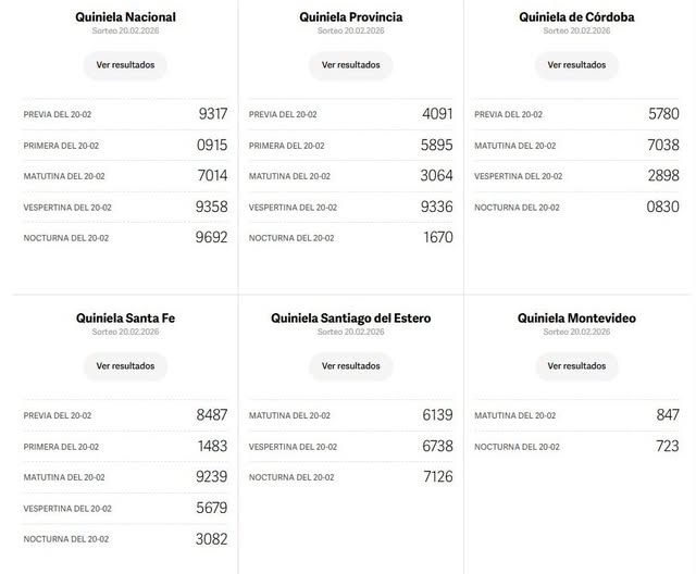 Quinielas: Nacional, Provincia, Córdoba, Santa Fe, Santiago del Estero y Montevideo del 20 de Febrero